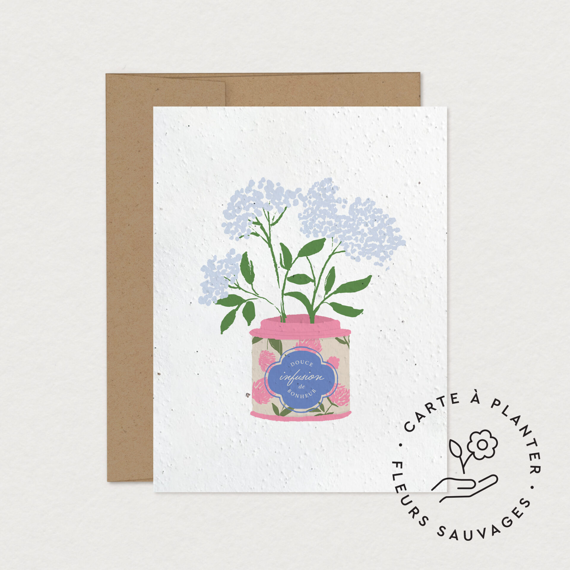 Fabriquée à partir de papier ensemencé contenant des graines de fleurs sauvages, cette carte écologique se transforme en fleurs une fois plantée, prolongeant ainsi votre message de façon unique et durable. Idéale comme carte de souhaits originale, carte de rétablissement ou attention délicate, elle séduira les amateurs de papeterie écoresponsable et de produits faits avec intention.